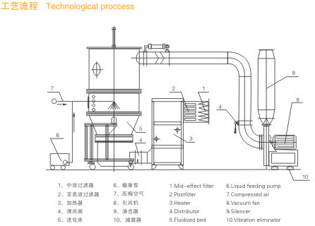 物料粉末粒子,在原料容器(流化床)中呈环形流化状态,受到经过净化后的加热空气预热和混合,将粘合剂溶液雾化喷入,使若干粒子聚集成含有粘合剂的团粒,由于热空气对物料的不断干燥,使团粒中水分蒸发,粘合剂凝固,此过程不断重复进行,形成理想的、均匀的多微孔球状颗粒。