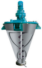 由摆线针轮减速机连接中心螺杆及外层螺带以相同转速转动。工作时,中心螺杆将混合物料由底部提升到顶部,同时线速度较大的外部螺带将物料由下而上沿锥形筒壁盘提升,二种运动在离心力作用下又将物料沿切线方向抛向空间,物料产生强烈的对流剪切、扩散,从而达到快速混合的目的。(螺杆也可做成反向螺杆)。