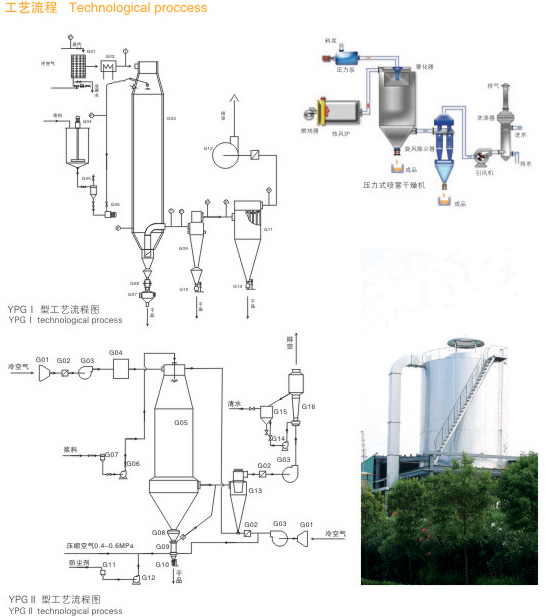 产品概述:压力式喷雾干燥造粒机是采用压力式雾化器借助隔膜泵的压力将溶液或浆状的物料雾化成